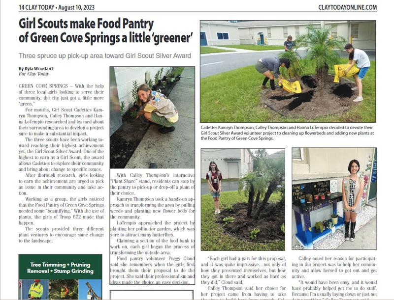 Clay Today • 10th August 2023 Girl Scouts make Food Pantry of Green Cove Springs a little 'greener' 7 Sources | Word Count: 970